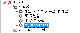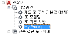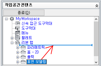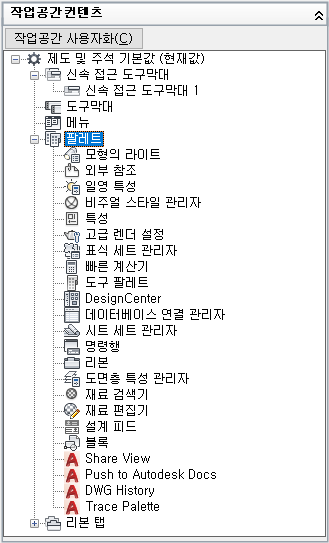 - 사용자화 탭에 있는 <파일 이름>의 사용자화 창에서 작업공간 노드 옆에 있는 더하기 기호(+)를 클릭하여 노드를 확장합니다.