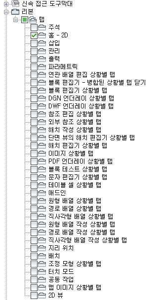CUI 편집기를 사용하여 신속 접근 도구막대, 리본 탭 및 패널, 도구 팔레트, 도구막대 및 풀다운 메뉴의 표시를 조정할 수 있습니다.