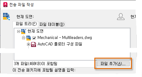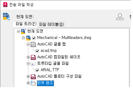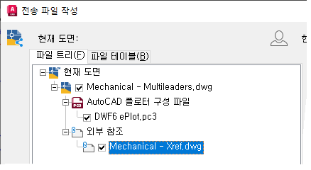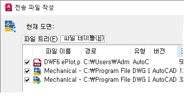 전자 전송 기능을 사용하면 현재 도면에서 참조된 파일이 스캔되어 전송 파일 작성 대화상자에 해당 파일이 표시됩니다.