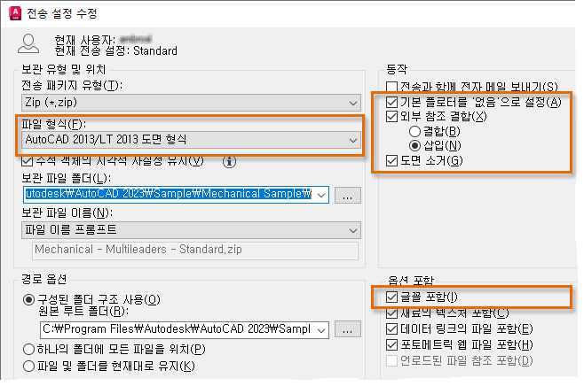 전송 유형 및 위치에서 파일 형식 드롭다운 리스트를 클릭하고 AutoCAD 2013/LT 2013 도면 형식을 선택합니다.