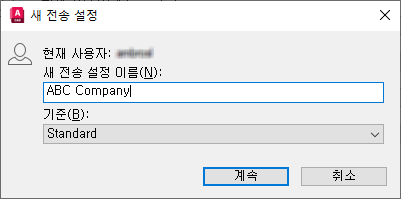 새 전송 설정 대화상자의 새 전송 설정 이름 문자 상자에서 기본 이름을 ABC Company로 대치합니다. 계속을 클릭합니다.