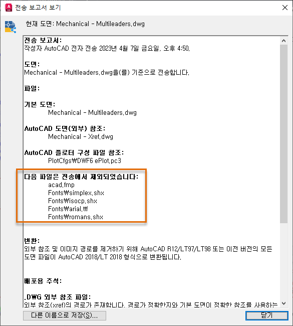 전자 전송 기능을 사용하는 경우 현재 도면과 해당 도면에서 참조하는 다음 지원 파일 유형이 전송 패키지에 자동으로 추가됩니다.