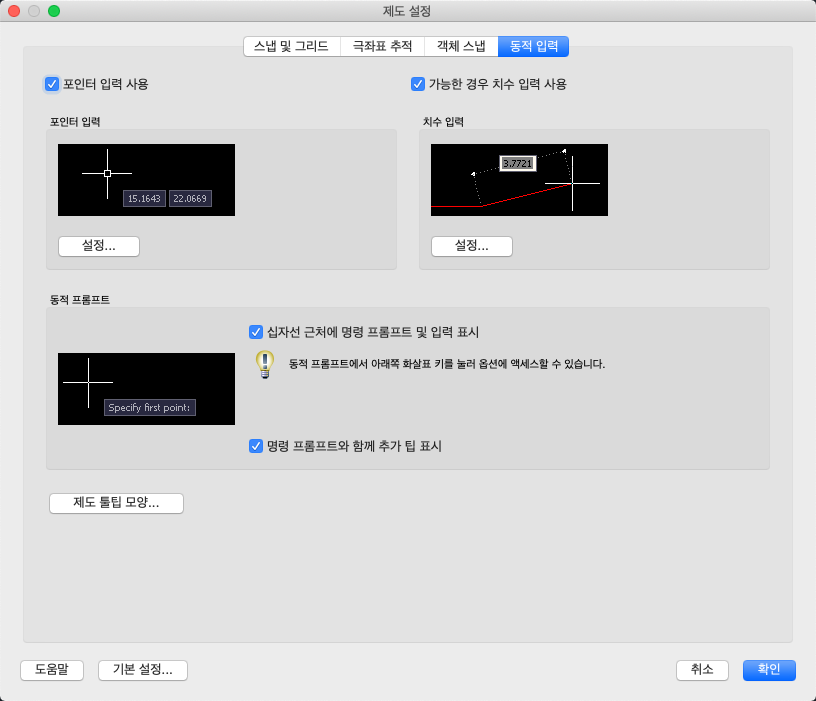 포인터 입력, 치수 입력, 동적 프롬프트 및 제도 툴팁의 모양을 조정합니다.
