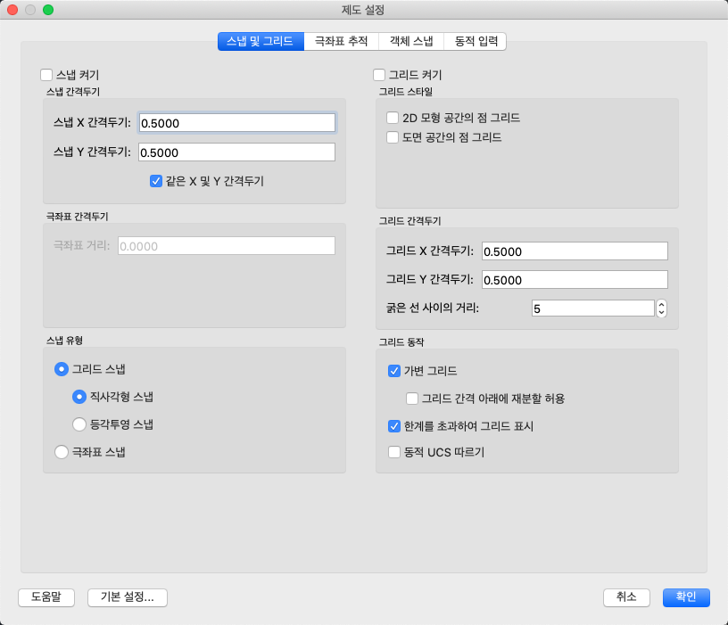 스냅 스타일 & 스타일 아래에 PolarSnap이 선택되어 있는 경우 스냅 증분 거리를 설정합니다. 이 값이 0이면 PolarSnap 거리를 스냅 X 간격두기의 값으로 가정합니다. 극좌표 거리 설정은 극좌표 추적이나 객체 스냅 추적과 함께 사용됩니다. 추적하기 기능이 작동되어 있지 않은 경우 극좌표 거리 설정은 아무런 영향을 주지 않습니다. (POLARDIST 시스템 변수)