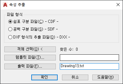 추출된 속성 데이터에 대한 파일 이름 및 위치를 지정합니다. 추출된 속성 데이터에 대한 경로 및 파일 이름을 입력하거나 출력 파일을 선택한 다음 표준 파일 선택 대화상자를 사용하여 기존의 템플릿 파일을 검색할 수 있습니다. .txt 파일 확장자가 CDF 또는 SDF 파일에 사용되고 DXF 파일에는 .dxx 파일 확장자가 사용됩니다.