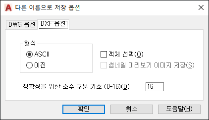ASCII 파일을 작성할지 또는 이진 DXF 파일을 작성할지를 지정합니다. 문자 편집기로 ASCII 형식의 DXF 파일을 읽을 수 있으며, ASCII 형식 DXF 파일은 광범위한 범위의 응용프로그램과 호환됩니다. 이진 형식 DXF 파일이 보다 압축된 형식입니다. 이진 형식 파일로 읽기 및 쓰기 작업을 수행하는 것이 ASCII 형식 파일로 수행하는 것보다 빠릅니다.
