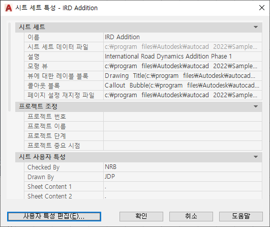 시트 세트에서 사용되는 도면이 들어 있는 폴더의 경로 및 이름을 표시합니다.