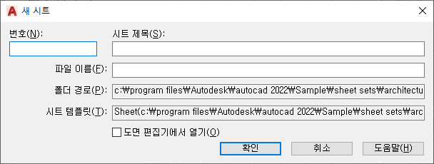 시트 번호를 지정합니다. 처음 시트를 작성할 때 시트 번호를 채우지 않는 것이 좋습니다. 기본적으로 새 시트의 도면 이름 및 배치 이름은 시트 제목을 가진 시트 번호입니다.