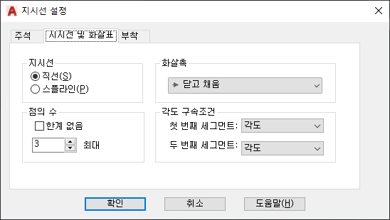 지시선 주석 유형을 설정합니다. 선택한 유형에 따라 QLEADER 지시선 주석 프롬프트가 변경됩니다.