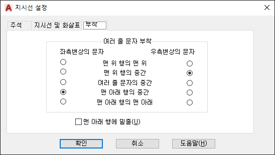 지시선과 여러 줄 문자 주석의 부착 위치를 설정합니다. 주석 탭에서 여러 줄 문자를 선택한 경우에만 이 탭을 사용할 수 있습니다.