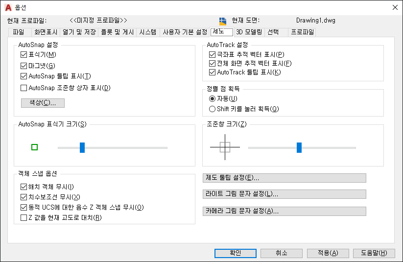 AutoSnap 표식기의 표시를 조정합니다. 이 표식기는 십자선을 스냅점 위로 가져 가면 표시되는 기하학적 기호입니다. (AUTOSNAP 시스템 변수)