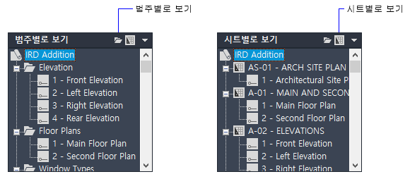 시트 리스트 탭에서 시트를 하위 세트라는 집합으로 정렬할 수 있습니다. 시트 뷰 탭에서 뷰를 범주라는 집합으로 정렬할 수 있습니다.