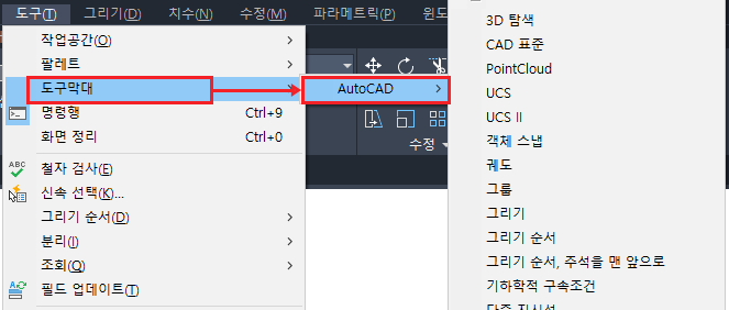 를 클릭하고 필요한 도구막대를 선택합니다.