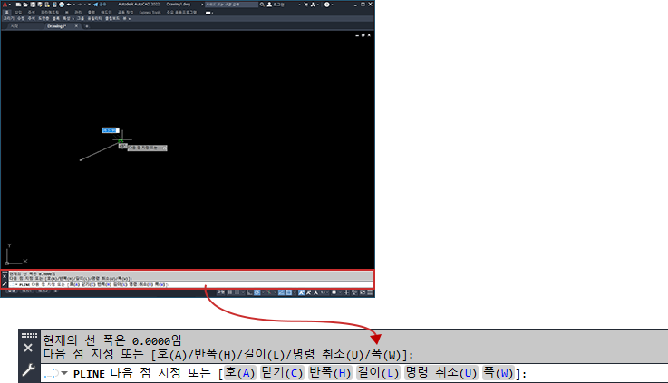 고정된 명령 윈도우는 응용프로그램 윈도우와 폭이 같습니다. 이 윈도우는 도면 영역 위나 아래의 고정된 위치에 표시됩니다.