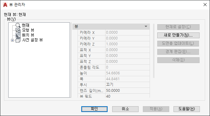 새 뷰/샷 특성 대화상자 또는 새 뷰 대화상자를 표시합니다.