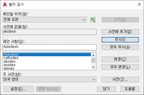 한 줄 문자, 여러 줄 문자, 다중 지시선 문자, 블록 속성의 문자, 외부 참조의 문자 및 치수에 추가된 문자 등에서 철자를 검사합니다.