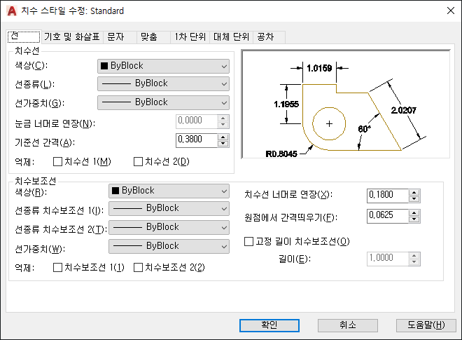 치수 선, 치수보조선, 화살촉 및 중심 표식의 특성과 형식을 설정합니다.