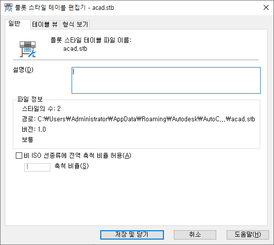편집하고 있는 플롯 스타일 테이블에 관한 정보 즉, 플롯 스타일의 수, 경로 및 플롯 스타일 테이블 편집기의 버전 번호를 표시합니다.