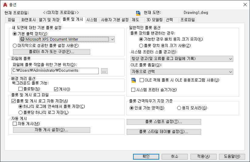 AutoCAD 릴리즈 14 또는 이전 버전에서 작성되어 AutoCAD 2000 및 이후 형식으로 저장된 적이 없는 도면이나 새 도면에 대한 기본 플롯 설정을 조정합니다.
