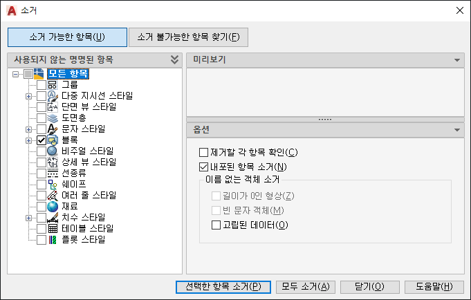 소거할 수 있는 현재 도면의 항목을 왼쪽의 트리 뷰 창에 나열합니다. 대화상자의 오른쪽에 있는 명명되지 않은 객체 소거 창 아래의 도면에서 추가 항목을 제거할 수 있습니다.
