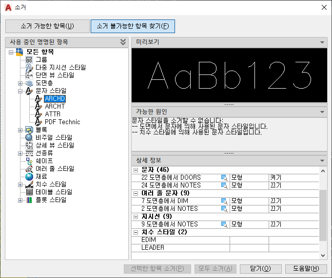 이러한 객체의 대부분은 현재 도면에서 사용되고 있거나 제거할 수 없는 기본 항목입니다. 개별 명명된 객체를 선택할 때 항목을 소거할 수 없는 이유가 표시됩니다.