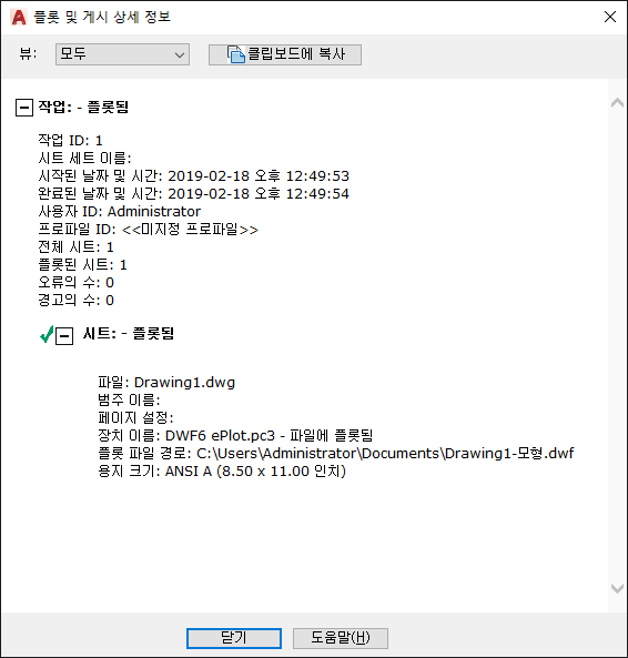완료된 모든 플롯 및 게시 작업과 이러한 작업 내의 시트에 대한 정보를 표시합니다.