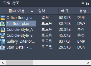 참조 이름 열에는 항상 현재 도면이 첫 번째 항목으로 표시되며 그 뒤에는 부착된 순서대로 나열되는 추가 부착 파일이 표시됩니다.