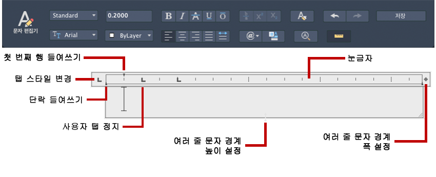 여러 줄 문자 객체에 대한 정렬을 설정합니다. 문자를 왼쪽, 중앙 또는 오른쪽으로 정렬하도록 선택할 수 있습니다. 문자의 자리를 맞추거나, 문자의 첫 번째와 마지막 글자를 mtext 상자의 여백에 맞춰 정렬하거나, 문자의 각 줄이 mtext 상자 여백 내에서 중앙에 오도록 할 수 있습니다. 행 끝에 입력된 빈 칸은 문자의 일부로 포함되어 행의 자리맞추기에 영향을 줍니다. (단일 행 문자에 대해서는 사용할 수 없습니다.)