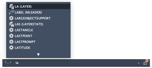 일부 명령에는 명령행에서 입력할 수 있는 약어 이름, 즉 명령 별칭이 있습니다. 예를 들어, circle을 입력하여 CIRCLE 명령을 시작하는 대신 c를 입력하고 Enter 키를 누르면 됩니다. 명령 제안 사항 리스트(표시되는 경우)에서 명령 이름 앞에 별칭이 표시됩니다. C(CIRCLE)