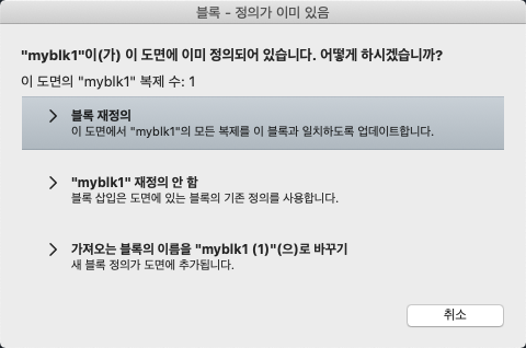 현재 도면에서 블록 정의를 재정의하면 도면에서 이전에 삽입한 블록과 이후에 삽입할 블록이 둘 다 영향을 받습니다.
