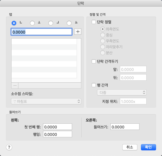 단락에 사용할 탭 정지 및 소수점 스타일을 지정합니다.