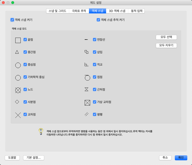 실행 중인 객체가 스냅될 때 설정할 수 있는 객체 스냅을 나열합니다.