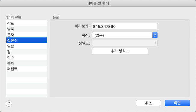 각도, 십진수, 점 및 정수 데이터 형식의 경우에만, 테이블 셀에 추가 형식 옵션을 설정하는 추가 형식 대화상자를 엽니다.