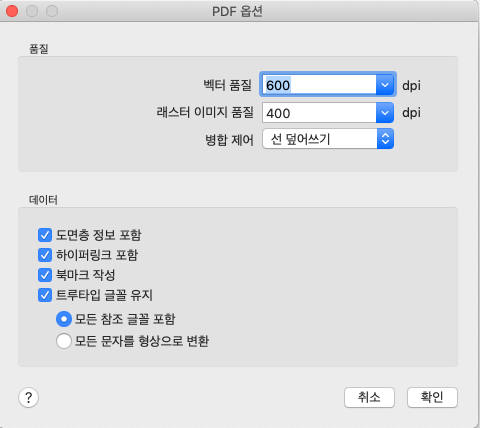 - PDF 파일에 트루타입 글꼴이 포함되므로 PDF 뷰어에서 해당 글꼴을 사용할 필요가 없습니다. 이 옵션을 선택하지 않을 경우, PDF 뷰어에서 대체 글꼴을 사용합니다.