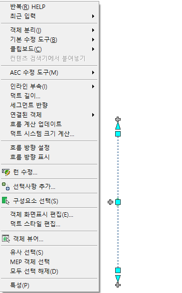 도면 영역에서 마우스 오른쪽 버튼을 클릭하면 현재 선택한 객체에 따라 다른 상황에 맞는 메뉴가 표시됩니다. 예를 들어, 하나 이상의 덕트 객체를 선택한 경우 덕트에 대한 상황에 맞는 메뉴가 다음과 같이 표시됩니다.
