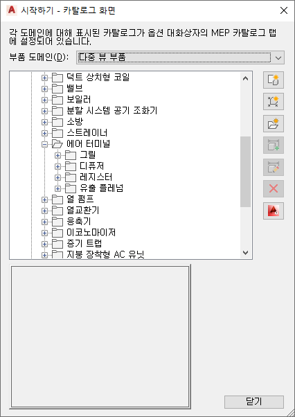 컨텐츠 작성기를 시작하면 시작하기 - 카탈로그 화면 대화상자가 표시됩니다. 이 작업 관련 대화상자는 전환 역할을 하므로 여러 작업 환경에 신속하게 액세스할 수 있습니다. 시작하기 - 카탈로그 화면 대화상자에는 부품 카탈로그 브라우저와 아이콘 막대가 있습니다. 옵션 대화상자의 MEP 카탈로그 탭에서 지정한 로드된 부품 카탈로그 리스트에서 카탈로그를 선택합니다. 부품 카탈로그 및 부품이 카탈로그에 저장되는 방법에 대한 자세한 내용은 부품 카탈로그 주요 사항을 참고하십시오.