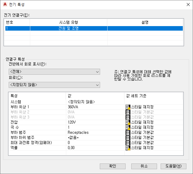 도면에 장치를 추가하면 전기 특성 워크시트를 사용하여 연결구를 구성해야 합니다. 일반적으로 장치에는 전기 연결구가 하나 있습니다.