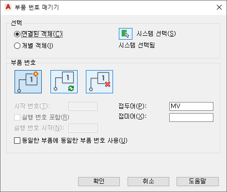 - 동일한 부품에 동일한 부품 번호 사용을 클릭하여 이 옵션을 설정하거나 취소합니다.