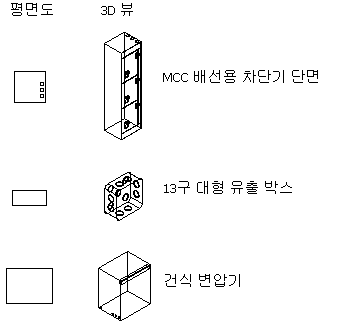 일반적으로 평면도에 장치를 추가하여 시공 도서를 작성하지만, 다른 뷰에서는 부품을 다르게 표시할 수도 있습니다. 예를 들어, 전기 설비 3D 뷰에서는 장치의 실제 형상을 표시할 수 있지만 2D 평면도에서는 장치를 단선 기호로 나타낼 수 있습니다.
