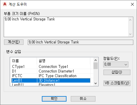 - 대화상자의 맨 위에서 부품 크기 이름(PrtSN)의 값을 클릭하고 inch Vertical Storage Tank를 입력합니다.