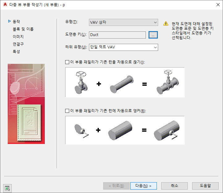 - 블록 기반 부품을 작성하거나 부품 패밀리에 부품 크기를 추가합니다. 마법사 모드에서는 부품 동작, 개별 부품 크기, 각 부품 크기 표현에 사용되는 AutoCAD 블록, 부품 선택 중에 도움이 되는 미리보기 이미지, 부품 연결구 및 특성 세트 정보를 정의하는 과정을 단계별로 안내합니다. 자세한 내용은 블록 기반 다중 뷰 부품을 작성하기 위해 컨텐츠 작성기 시작을 참고하십시오.