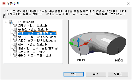 재료 유형별로 구성된 파이프 부품을 보여 주는 부품 선택 대화상자