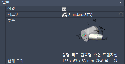 기본적으로 덕트 특성 팔레트에는 기본 특성이 표시됩니다.