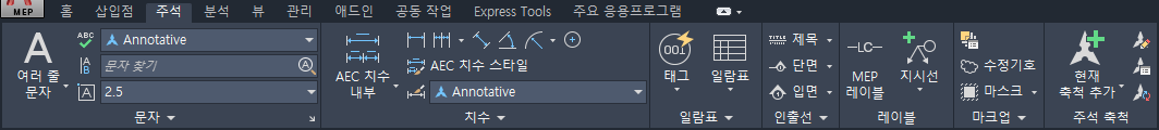 주석 달기 탭에는 도면 파일을 표시하는 데 도움이 되는 명령이 들어 있습니다.