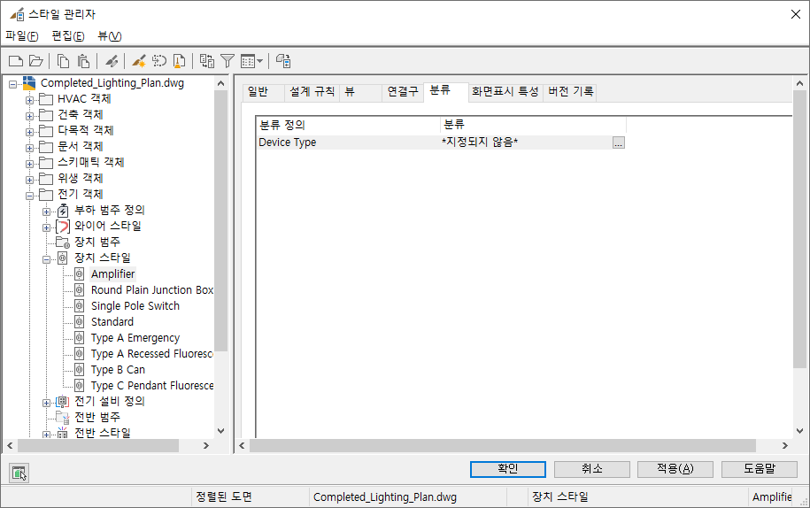 도면에 있는 장치를 유형별로 분류해야 하는 경우가 많기 때문에 AutoCAD MEP 2022 toolset에는 장치에 적용되는 장치 유형 분류 정의가 들어 있으며, 소프트웨어에 정의된 장치 유형의 분류가 여기에 포함됩니다.