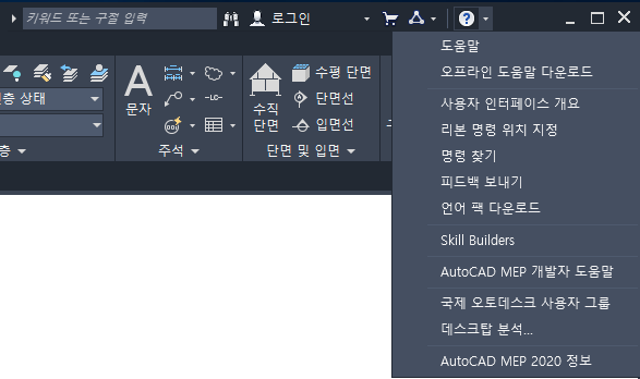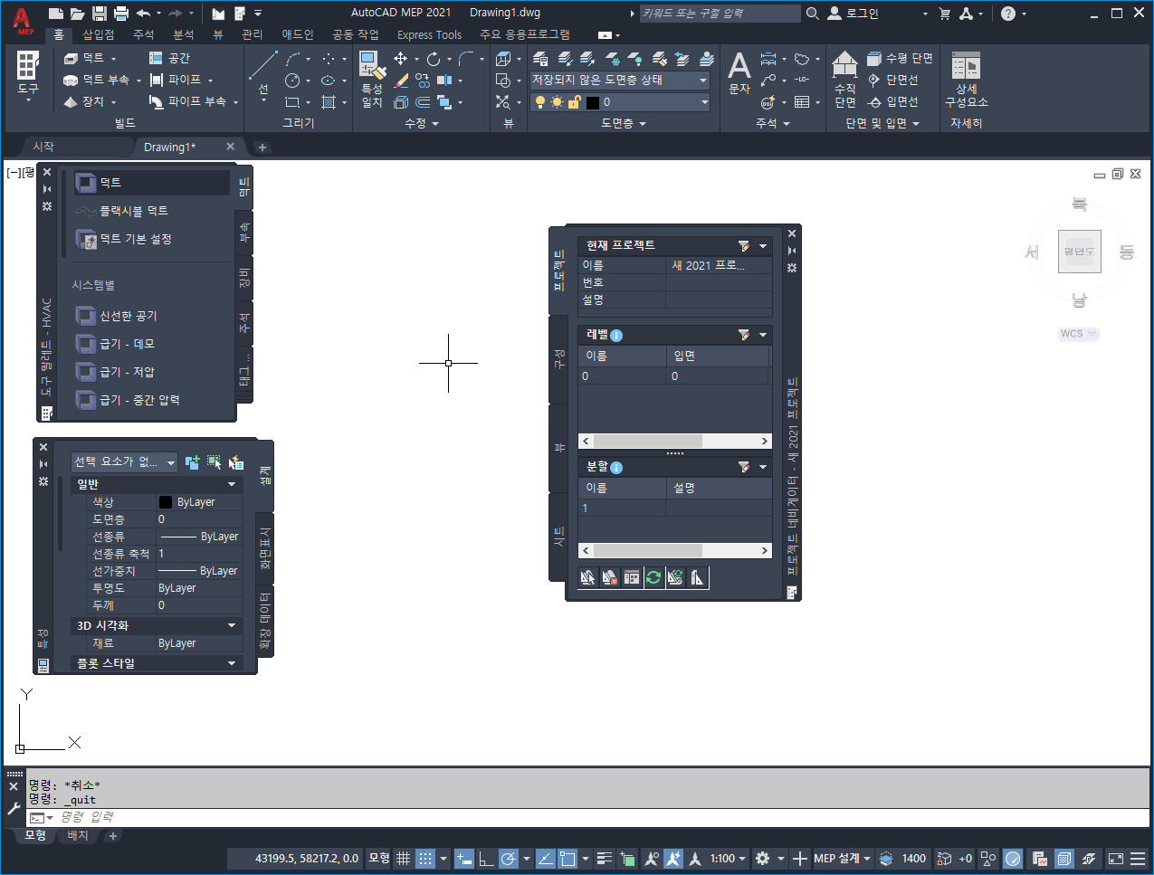 작업공간은 M/E/P 프로젝트 설정, 설계 작성 및 시공 도서 생성에 사용하는 리본, 도구 팔레트 및 기타 컨트롤이 포함된 도면 창으로 구성됩니다.