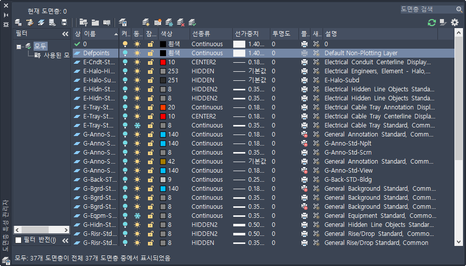 도면층 특성 관리자를 사용하면 현재 도면에서 도면층을 보고 관리할 수 있습니다.