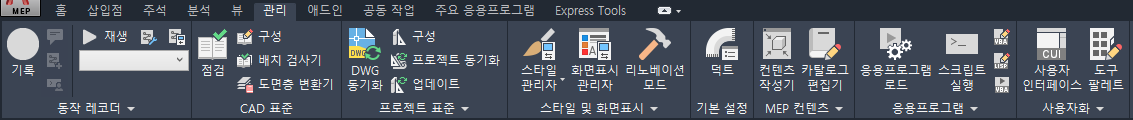 관리 탭에서는 고급 사용자 및 CAD 관리자용 기능을 찾을 수 있습니다.