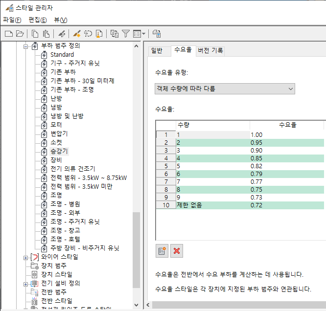 다른 예로 승강기처럼 수요율이 객체의 수량에 따라 달라지도록 설정된 경우, 최소 수요율 값은 72%(또는 .72)가 됩니다. 예상 부하는 600VA x 0.72(수요율 단위) = 432VA가 됩니다.