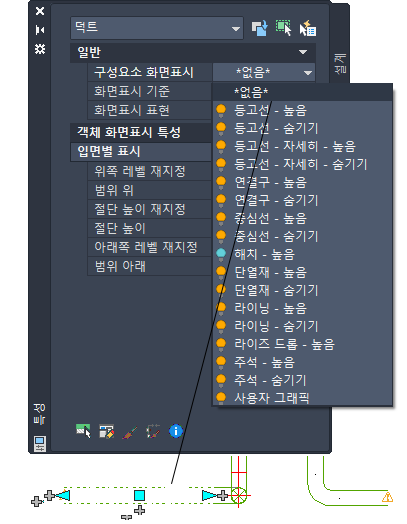 또한 특성 팔레트의 화면표시 탭을 사용하여 도면의 특정 객체에 적용되는 입면 기반 화면표시 구성요소를 구성할 수 있습니다.